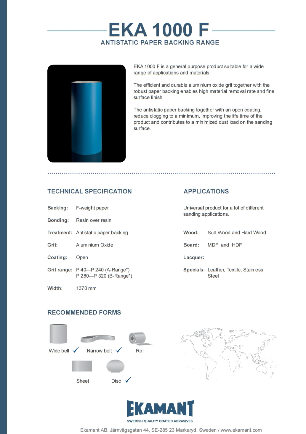 EKAMANT EKA 1000 F on niin sanottu yleisnauha, joka soveltuu useammalle eri materiaalille moneen eri käyttöön. Kestävä alumiinioksidijyvä yhdessä vahvan paperin kanssa mahdollistavat sekä kalibrointi- että viimeistelyhionnat, hyvää hiontajälkeä unohtamatta. Soveltuu siis sekä koville että pehmeille puulajeille, mutta myös MDF- ja HDF-levyille, nahkalle, teräkselle sekä tekstiileille.