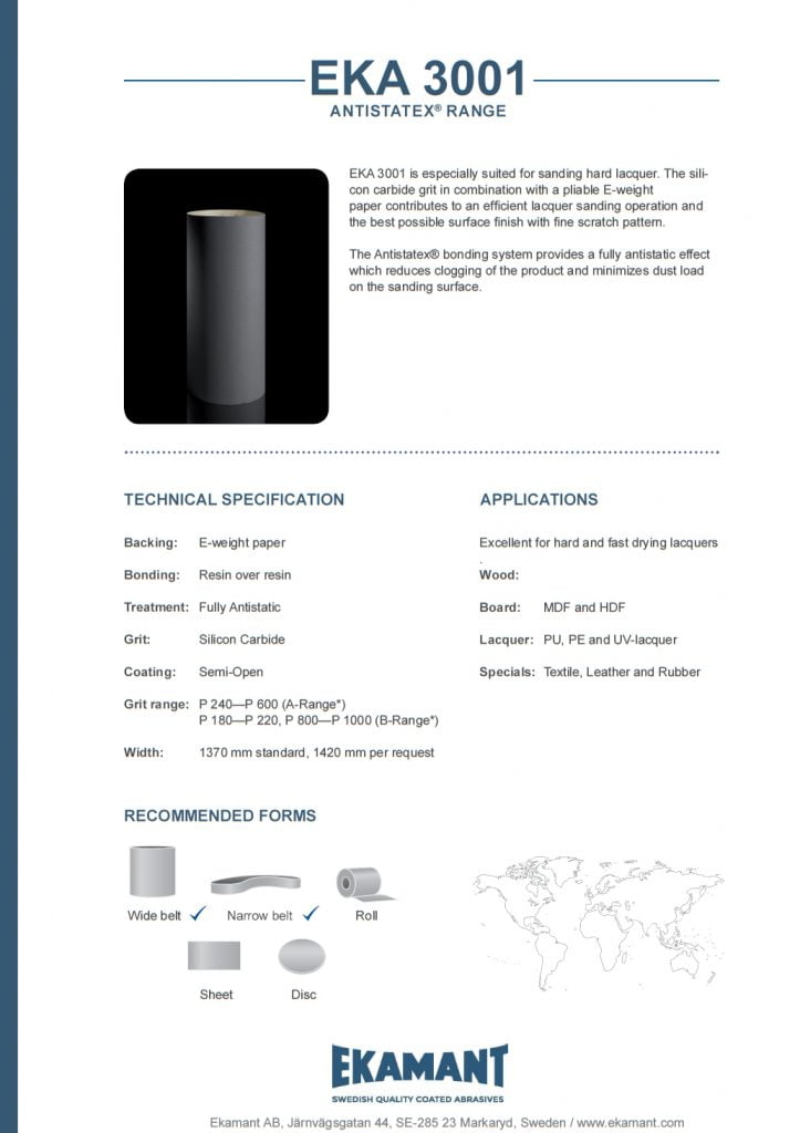 EKAMANT EKA 3001 -hiomanauha soveltuu erityisesti koville lakoille, mutta myös MDF- ja HDF-levyjen sekä nahkan ja kumin hiontaan. Piikarbidijyväpinnoite yhdessä E-paperin kanssa takaa tehokkaan hiontaprosessin ja parhaan mahdollisen lopputuloksen.