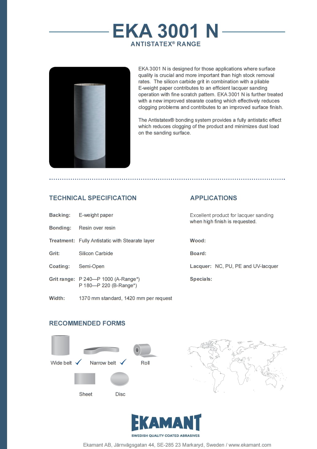 EKAMANT EKA 3001 N -hiomanauha on suunniteltu hiontaan, jossa pinnanlaadulla on suurempi merkitys kuin sillä, kuinka paljon nauhalla voidaan hioa pois kerrallaan. Piikarbidijyväpinnoite yhdessä E-paperin kanssa takaa tehokkaan hiontaprosessin ja parhaan mahdollisen lopputuloksen. EKA 3001 N on myös stearaattipinnoitettu, mikä vähentää merkittävästi tukkeutumista ja täten edesauttaa myös entisestään paremman pinnanlaadun saavuttamisessa. Soveltuu hyvin NC-, PU-, PE- ja UV-lakoille.