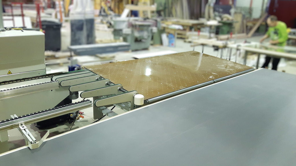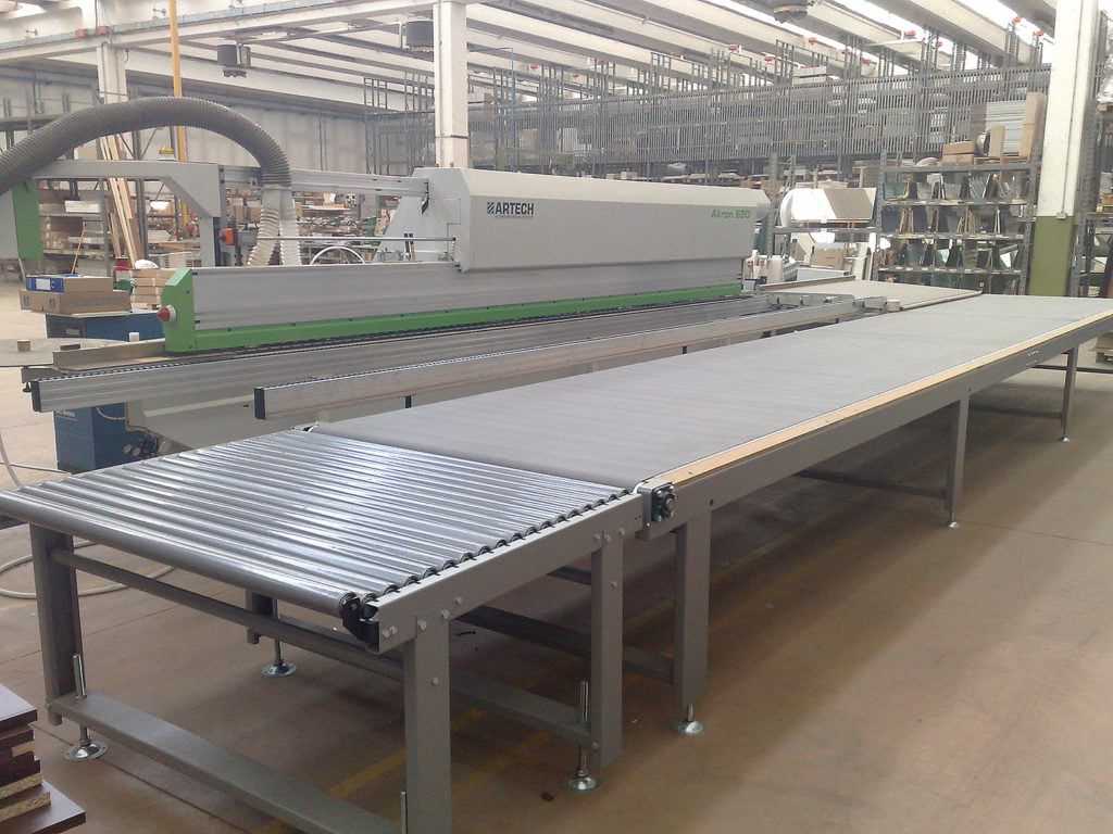 Moottoroitu palautuskuljetin, jossa kappaleen kääntö- ja läpisyöttömahdollisuus. Listoituskoneen jälkeen on kuljetin ja ilmakeventeinen kallistuva pöytä, mitat 1200 x 2400 mm.