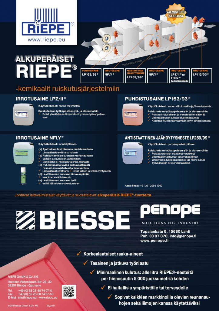 Riepe NFLY -irroitusnestettä käytetään pääsääntöisesti alumiini- ja akryylilistojen suojaamiseksi sekä estämään liiman tarttuminen paininteloihin. NFLY suojelee arkaa levyn reunaa painimilta estäen suoran kosketuksen listaan, jolloin listassa oleva suojanauha ei irtoa pois. Kemikaalia voidaan myös käyttää paininteloihin ruiskuttamista varten. Tällöin Riepen NFLY kulkeutuu teloista reunalistan mukana kopiotalloihin sekä kopiorulliin. Täten sulateliima ei pääse tarttumaan muihin koneen osiin, jolloin niitä ei tarvitse puhdistaa erikseen. Saatavana 10 ja 30 litran pakkauksissa sekä 500 ml spraypurkeissa.