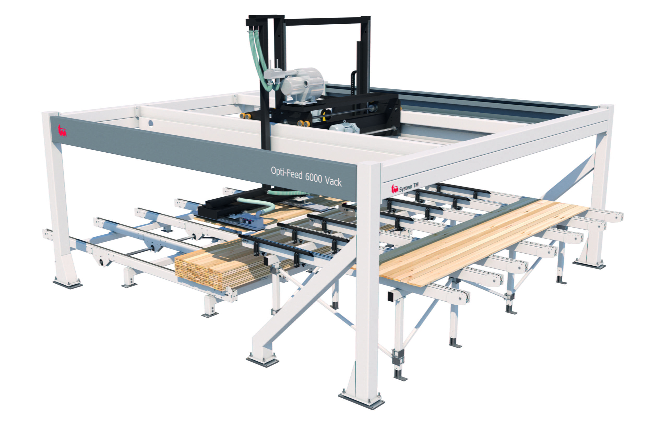 Opti-Feed 6000 Vack on alipainetoiminen syöttöyksikkö, joka syöttää osittaisia tai kokonaisia kappalekerroksia eri pääkoneisiin, kuten katkaisusahoihin, höyläkoneisiin, päätyponttauskoneisiin, halkaisuvannesahoihin ja hiomakoneisiin.