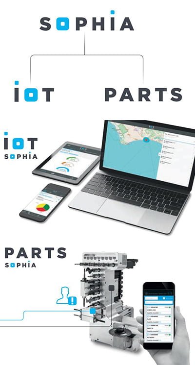 Sophia IoT perustuu tiedonkeruuseen antureilta ja ohjausjärjestelmästä. Näiden tietojen pohjalta voidaan ennakoida huoltotarpeita ja näin ollen minimoida tuotannon keskeytykset. Jos laite kuitenkin ennalta arvaamatta vikaantuu tuotannon aikana, voidaan Sophia IoT-järjestelmän kautta selvittää vika perinteistä vianhakua nopeammin. Käytössä on suojattu Internet-yhteys koneeseen ja sen tapahtumalokiin sekä mm. videokuvan välitysmahdollisuus teknisen tuen ja loppukäyttäjän välillä.