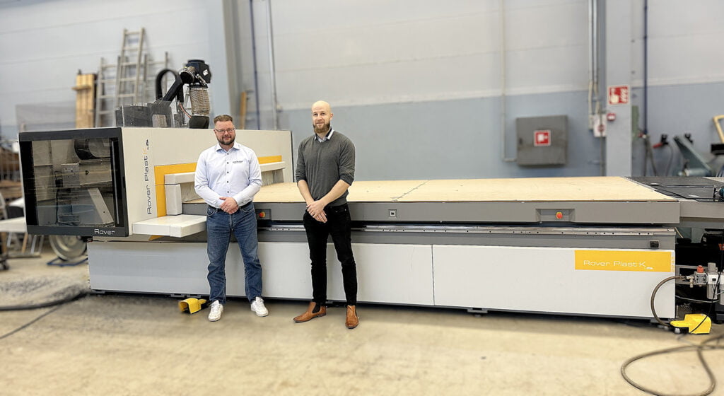 Kuva: Tero Tupakka ja Atte Kekkonen Ekomuovi Oy:n Biesse Rover Plast K Ft -CNC-työstökeskuksen vierellä.
