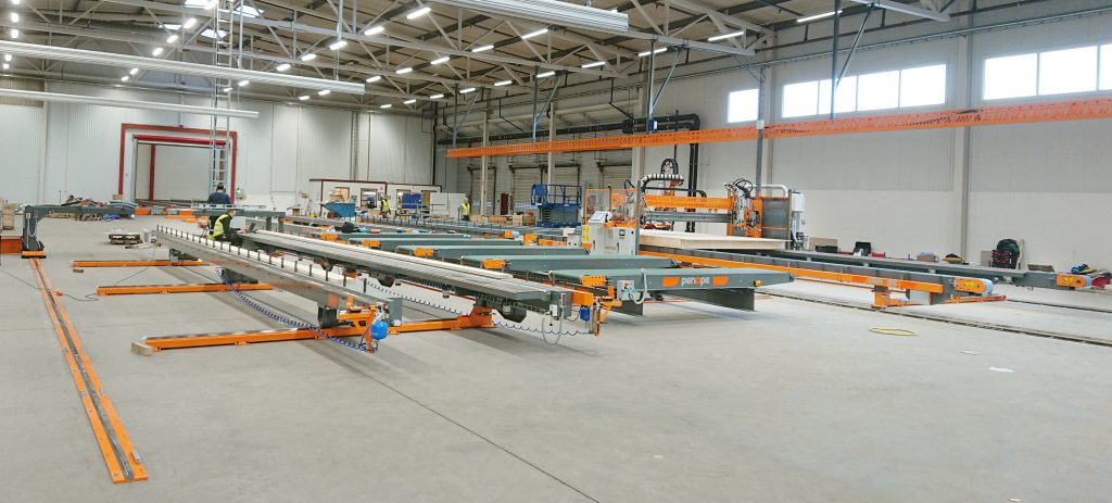 Linja on varustettu täysautomaattisella HYBRID -monitoimiportaalilla, joka sisältää kiinnitystyökalujen lisäksi jyrsinyksikön sekä liimanlevityslaitteen. Materiaalisyötön helpottamiseksi linjassa on kaksi materiaalivaunua, joiden avulla runkokomponentit sekä levymateriaalit saadaan helposti syötettyä elementtipöydille ylhäältä päin. Materiaalivaunut säästävät lattiapinta-alaa, koska kaikkea materiaalia ei tarvitse varastoida lattialla linjan vierellä.