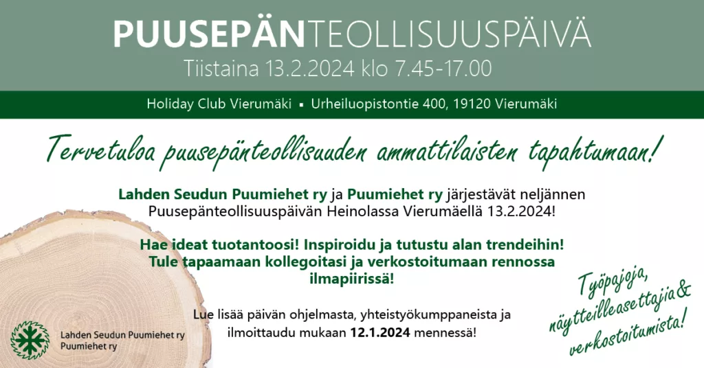 Lahden Seudun Puumiehet ry ja Puumiehet ry järjestävät neljännen Puusepänteollisuuspäivän Heinolassa Vierumäellä 13.2.2024!