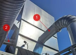 Kuvan suodattimen suodatuspinta-ala on 108m2 ja maksimi-ilmamäärä suodattimelle on 12000–13000 m3/h (valmistajan ilmoittama). Alun perin kuvan suodattimeen on ohjattu ilmaa n. 11300m3/h (kuvassa kohta 1.). Tuotannossa tapahtuneiden muutosten jälkeen suodattimeen on lisätty (kuvassa kohta 2.) ohjattavan ilman määrää n. 6300m3/h. Lisäyksen jälkeen ilmamäärä, joka suodattimelle ohjataan, on 17600m3/h, ja näin ollen suodatin on ylikuormitettu ilmaylimäärällä.